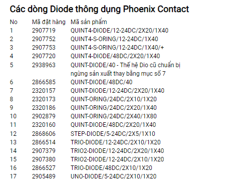 Phoenix Contact có 5 dòng Diode và modun nguồn dự phòng chính gồm :