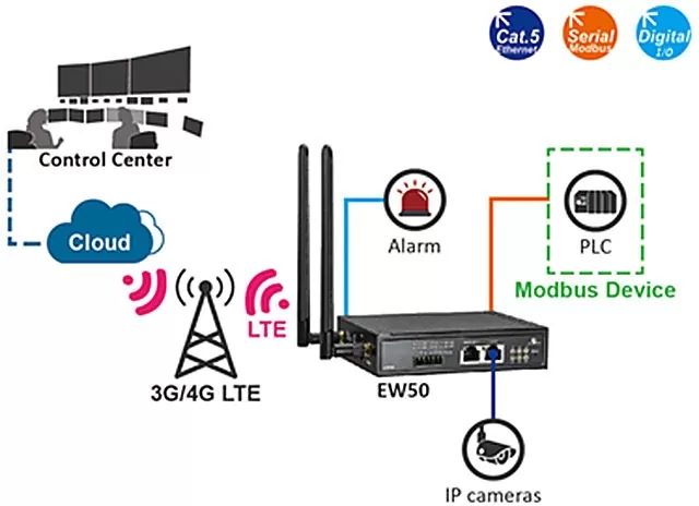 EW50-EUS MODEM KHÔNG DÂY VPN hỗ trợ 3G/4G với 2 cổng Ethernet 10/100/1000mbps trong đó 01 cổng có thể biến thành cổng Wan , 2 cổng RS232/485 hỗ trợ chuyển đổi modbus RTU-TCP hoặc Serial to TCP.