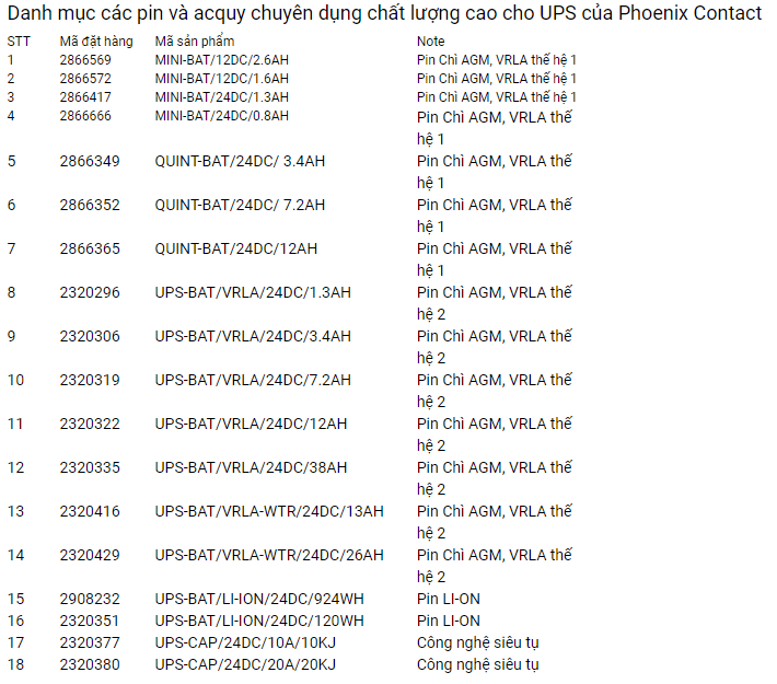 Là Dòng acquy/pin chất lương cao theo dạng modun với nhiều công nghệ chì, Li-On, siêu tụ chuyên dụng cho Quint UPS, TRIO UPS, MINI UPS, and STEP UPS. Các dòng Pin có đầy đủ các tiêu chuẩn công nghiêp để sử dụng trong các ngành công nghiệp đòi hỏi khả năng vận hành bền bỉ trong môi trường công nghiệp như đóng tàu , dầu khí , hàng không ..ec